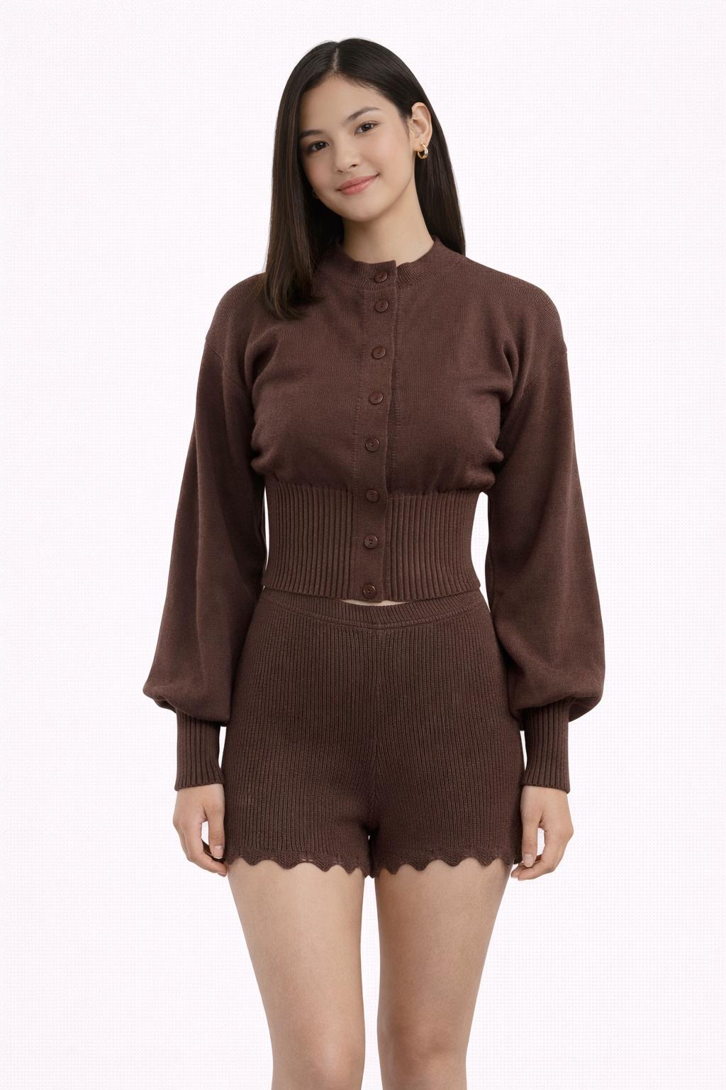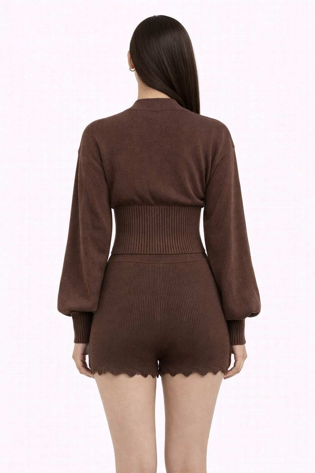 The long balloon sleeves add soft volume, while the fitted cuffs keep the shape refined. Made from a soft, stretchy knit, this top is ideal for a polished lounge look or styled up for going out. Pair it with the matching scallop-hem shorts for a chic, coordinated finish.