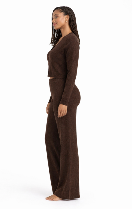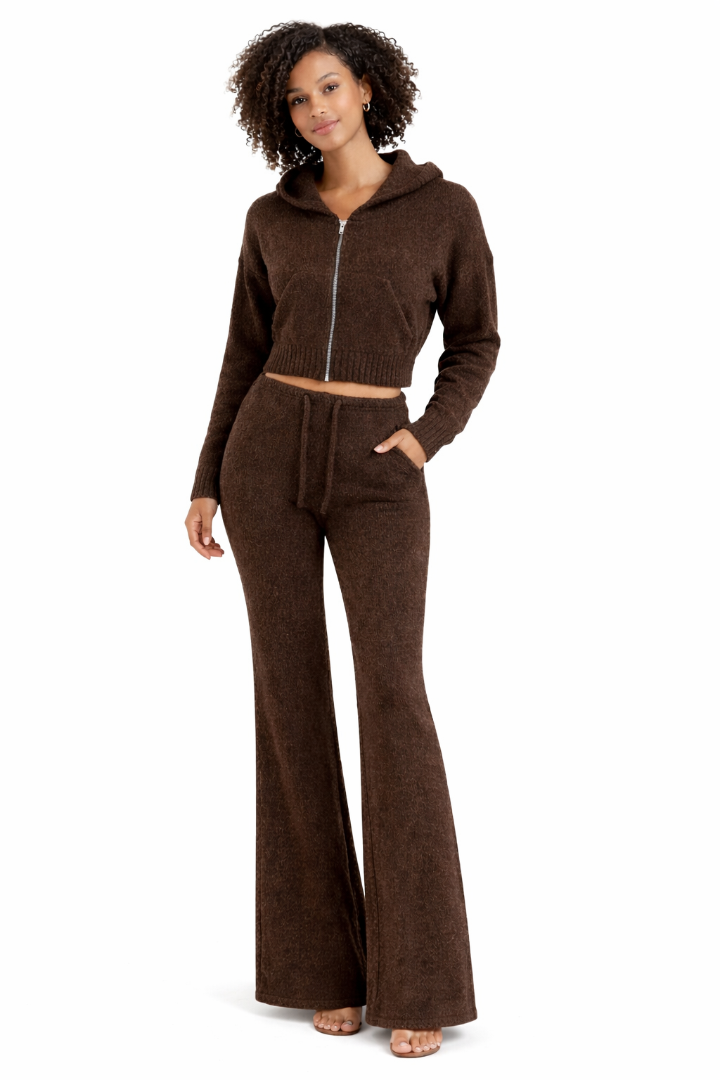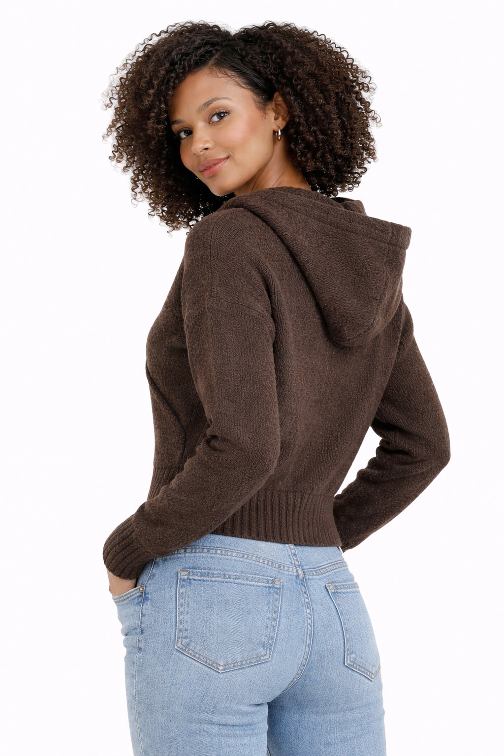 Meet your new go-to layer: a cropped knit zip-up hoodie crafted from a beautifully soft, textured yarn and made with care in the UK at our Oon Clothing factory. Designed in a rich chocolate shade, this piece blends cosy comfort with a modern, flattering silhouette.