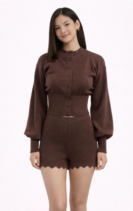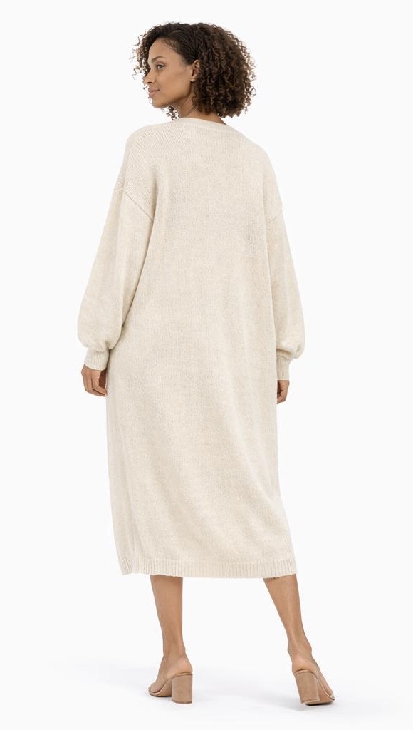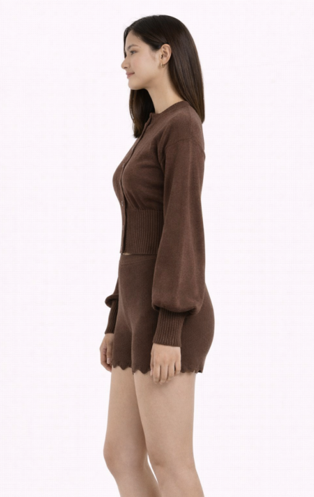 Crafted with a soft, smooth knit and finished with subtle ribbed cuffs and hem, this cardigan delivers a luxurious feel while keeping the fit structured. Its long sleeves and gentle balloon shape add a modern touch, making it ideal for everyday wear — from lounging to layering over your favourite outfits.