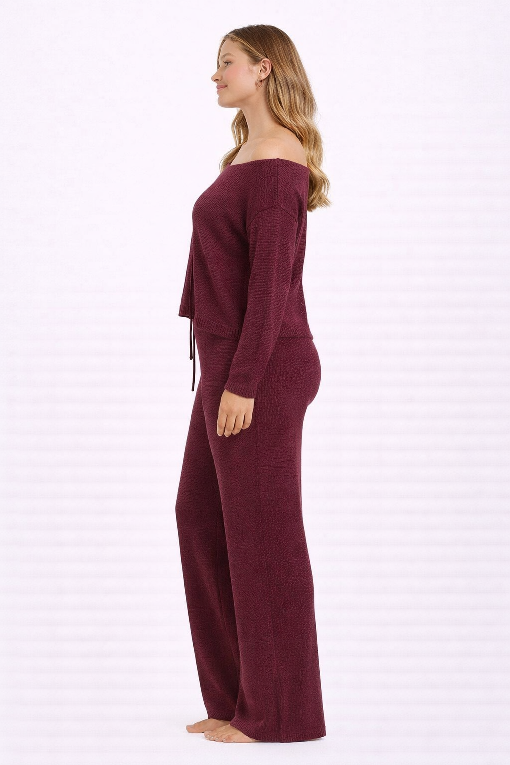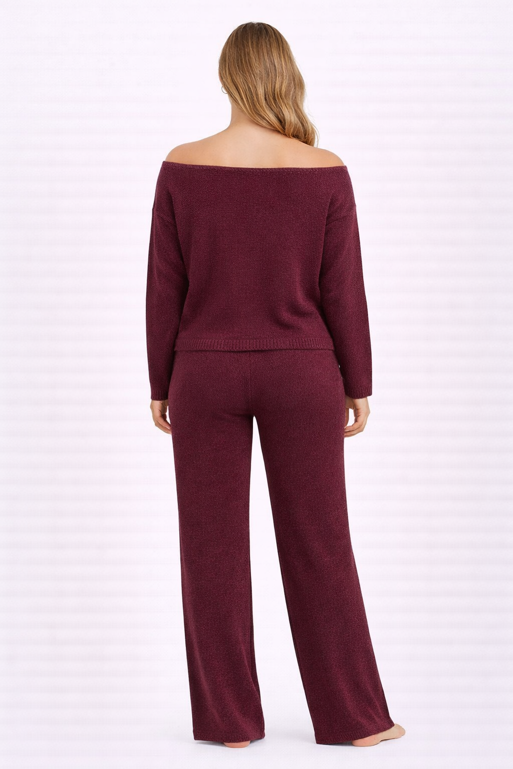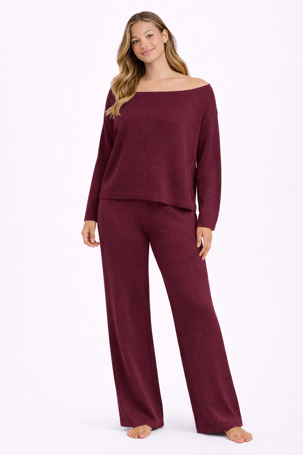 This off-shoulder knit jumper brings effortless elegance to everyday comfort. Designed in a rich burgundy, it features a soft, relaxed silhouette that drapes beautifully over the body. The wide off-the-shoulder neckline adds a feminine touch while allowing you to style it both slouched or straight across for a cleaner look.