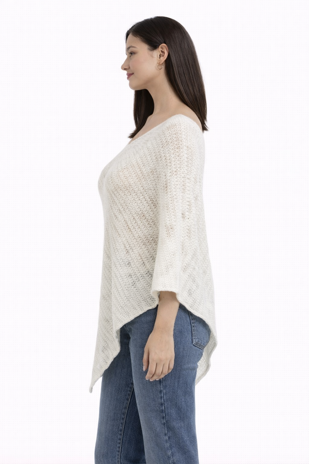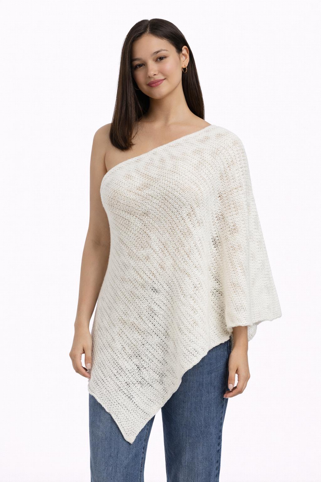 Lightweight one-shoulder knitted poncho with an airy open-knit texture and a soft, flattering drape.