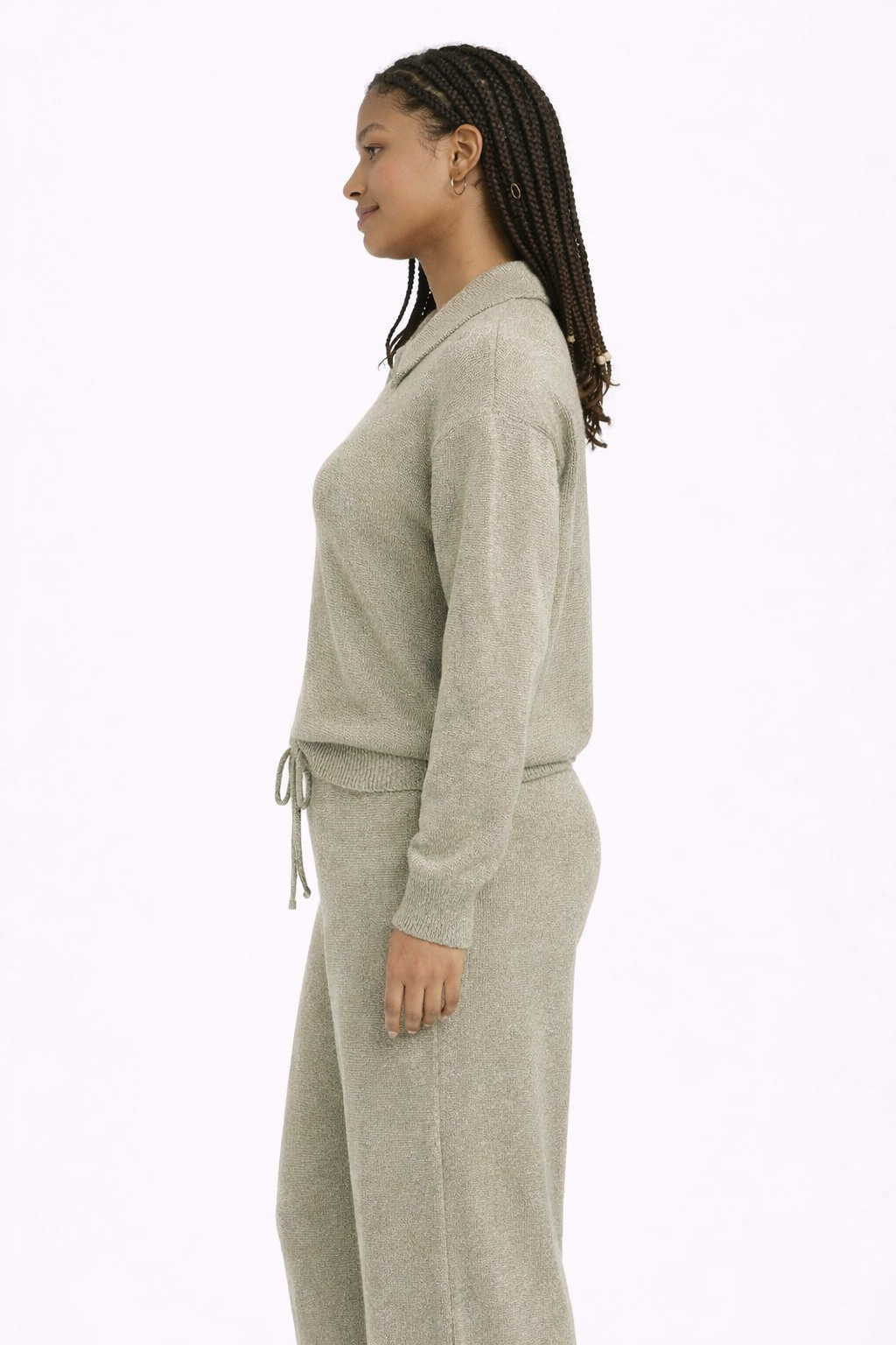 The knit has a subtle texture that enhances the fabric without adding weight, making it perfect for layering or wearing alone. Whether paired with the matching lounge trousers or styled with jeans and leggings, this top brings a clean, modern finish to everyday dressing.